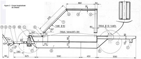Enfin, les traverses U et W seront réunies en leur centre par un longeron X, en profilé de 50 x 30 mm de section, qui aura 860 mm de longueur. Pour achever la construction du châssis, il suffira de fixer les deux Silentblocs Y sur les longerons arrière (fig. 3). A ce stade, le châssis sera déposé du marbre, nettoyé, poncé (en particulier, au niveau des soudures de la coque), puis recouvert d'une couche de peinture noire mate.