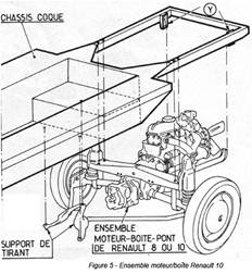 Le moteurLe "coupé sport" sera propulsé par un ensemble moteur-boîte-pont provenant d'une Renault 8 ou 10, qui sera monté directement à l'arrière du châssis. Simplement, on remplacera auparavant les ressorts d'origine, qui seront trop vigoureux pour le faible poids du véhicule (650 kg), par des ressorts récupérés sur une Dauphine Renault.